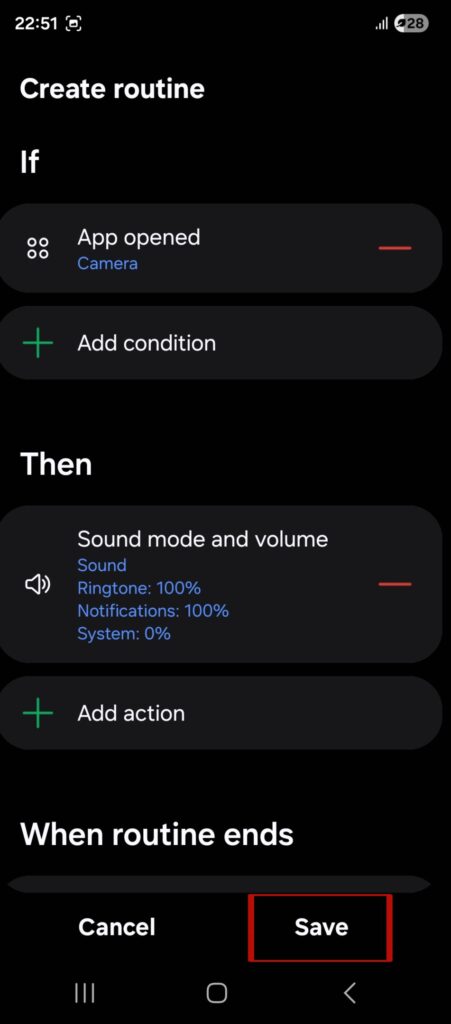 Step 9. Click the Save button. (Look at the screenshot below, it implies that as long as you keep the Camera application open in your smartphone the system volume would remain at 0% and after exiting the application it would get back to the way it was before.)